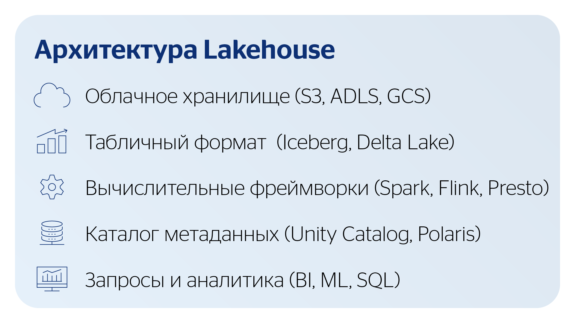 Lakehouse использует современные форматы таблиц (Apache Iceberg, Delta Lake) для обеспечения промышленной надёжности на базе недорогого облачного хранилища.