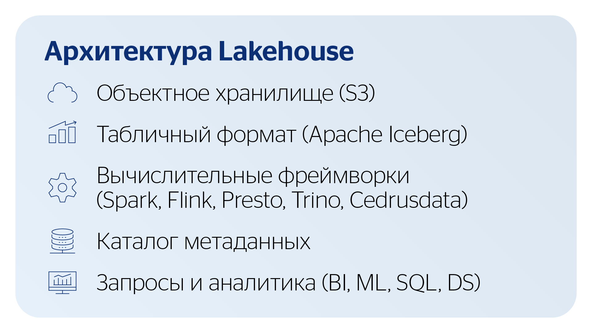 Lakehouse использует современные форматы таблиц (Apache Iceberg) для обеспечения промышленной надёжности на базе недорогого объектного хранилища.
